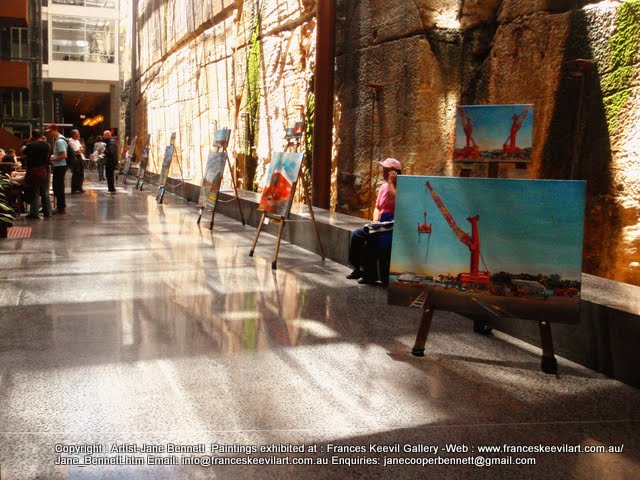 A small selection of my paintings of the East Darling Harbour Wharves and their transformation into the Barangaroo precinct were exhibited for one day only in the foyer of the LendLease Headquarters 30, The Bond directly opposite the Barangaroo site itself. Here they are displayed in front of the spectacular escarpment wall of yellowblock sandstone, catching the dying embers of the afternoon sun.